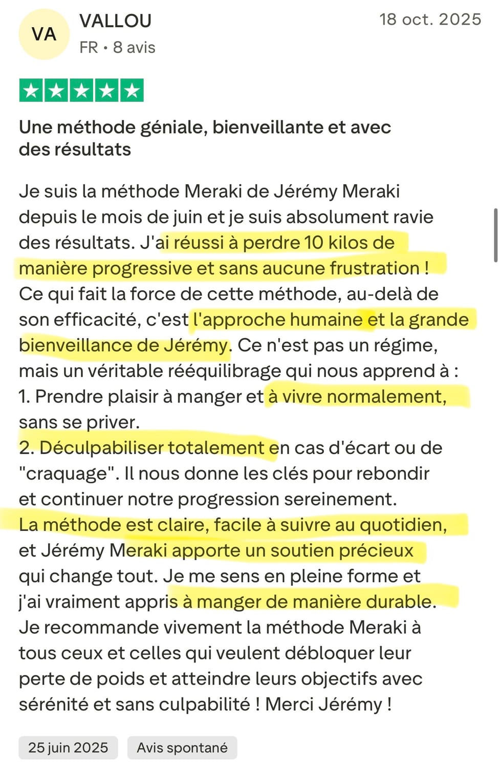 Mais la méthode ne repose pas là-dessus. On va surtout se baser sur la méthode MERAKI, ton rééquilibrage alimentaire, une alimentation adaptée avec des plaisirs conservés, et la marche au quotidien.